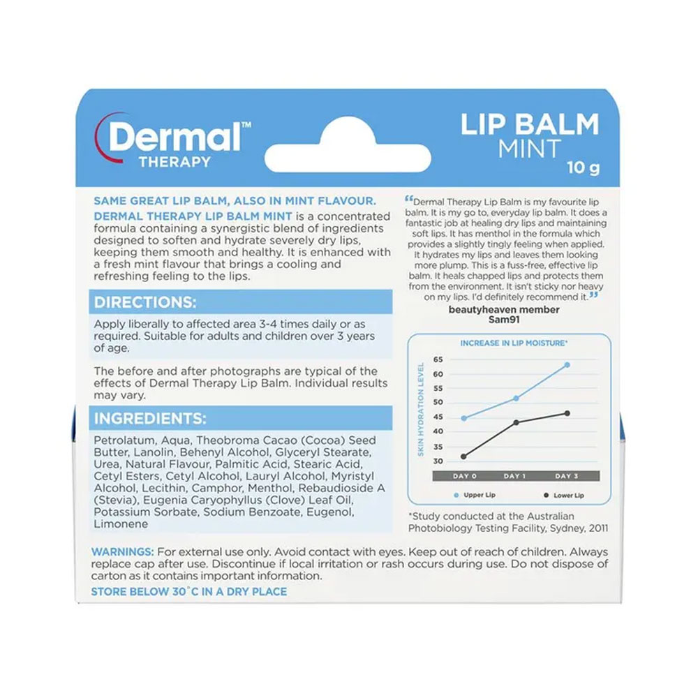 더말테라피 립밤 민트는 건조하고 갈라진 입술의 건강을 유지하고 개선하기 위해 설계된 보습 립밤입니다. 바세린과 코코아씨버터는 깊은 보습과 영양 공급에 도움을 주며, 캠퍼와 멘톨은 시원하고 상쾌한 민트 감각을 제공합니다. 일상생활에서 언제든지 간편하고 효율적으로 사용할 수 있도록 휴대용 튜브 형태로 설계되었습니다.