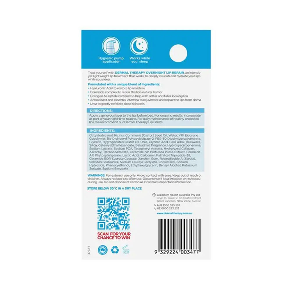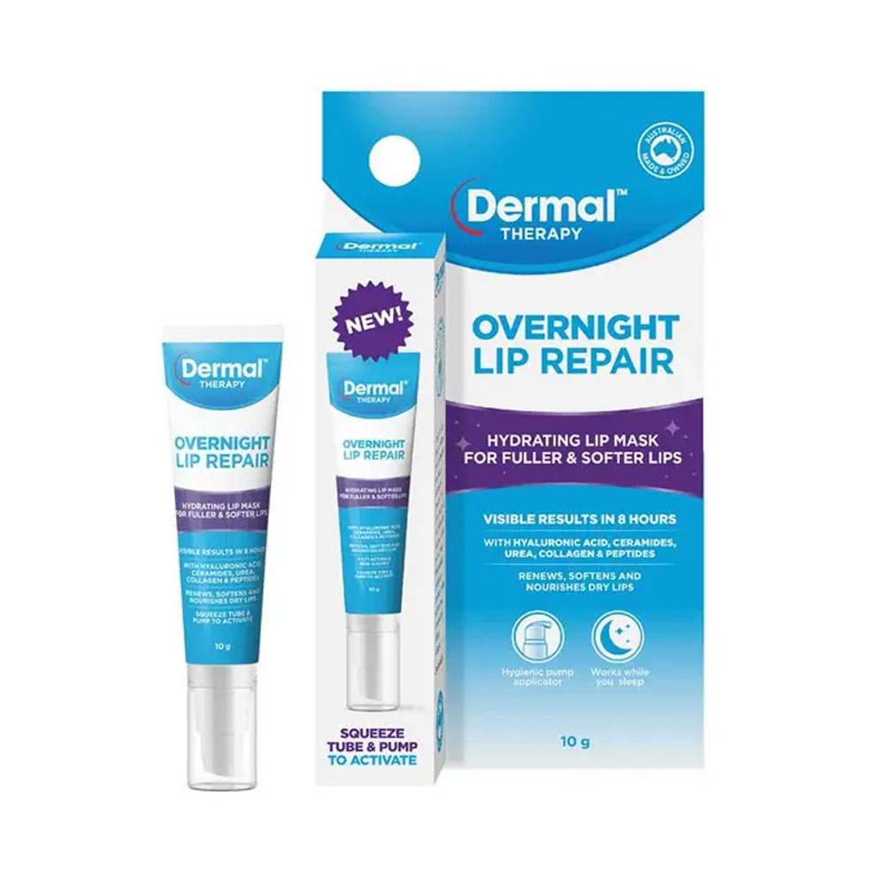 더말테라피 오버나이트 립 리페어는 건조하고 손상된 입술을 밤사이 집중적으로 케어하기 위해 설계된 립 트리트먼트 제품입니다. 주요 성분인 소듐하이알루로네이트는 깊은 보습 효과를 제공하며, 바쿠치올은 항산화 작용으로 피부 개선을 돕습니다. 또한 하이드롤라이즈드콜라겐과 세라마이드 성분은 입술 탄력을 강화하고 보호막을 형성하여 건강하고 촉촉한 상태를 유지합니다.